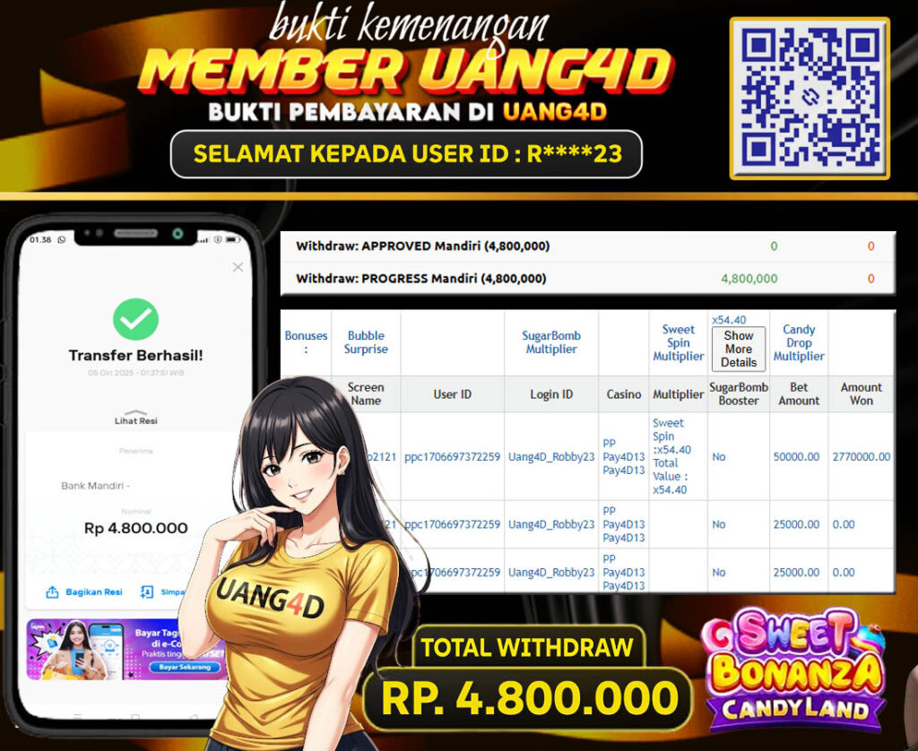 UANG4D dikenal sebagai situs terpercaya yang selalu menghadirkan pengalaman bermain slot online yang aman, fair, dan berlisensi resmi. Di sini, kami tidak hanya sekadar memberikan janji, tapi bukti nyata berupa slip kemenangan yang dapat Anda lihat secara langsung.