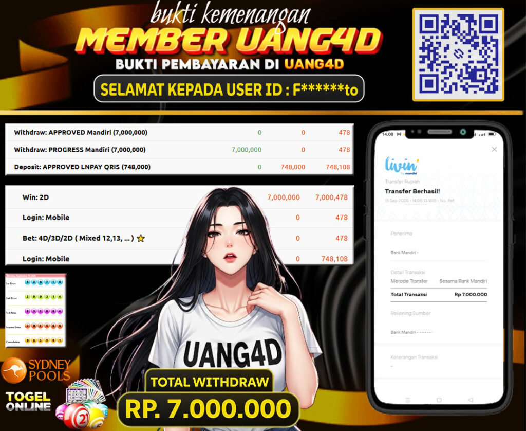 Setiap hari, member UANG4D berhasil meraih jackpot besar dari berbagai provider togel ternama yang kami sediakan, seperti Sydney, Singapore, Hongkong dan masih banyak lagi. Kami secara rutin menampilkan bukti screenshot atau rekapan kemenangan yang berhasil diraih, mulai dari kemenangan ratusan ribu hingga puluhan juta rupiah. Semua slip kemenangan ini kami hadirkan untuk membuktikan bahwa di UANG4D, peluang menang itu nyata.